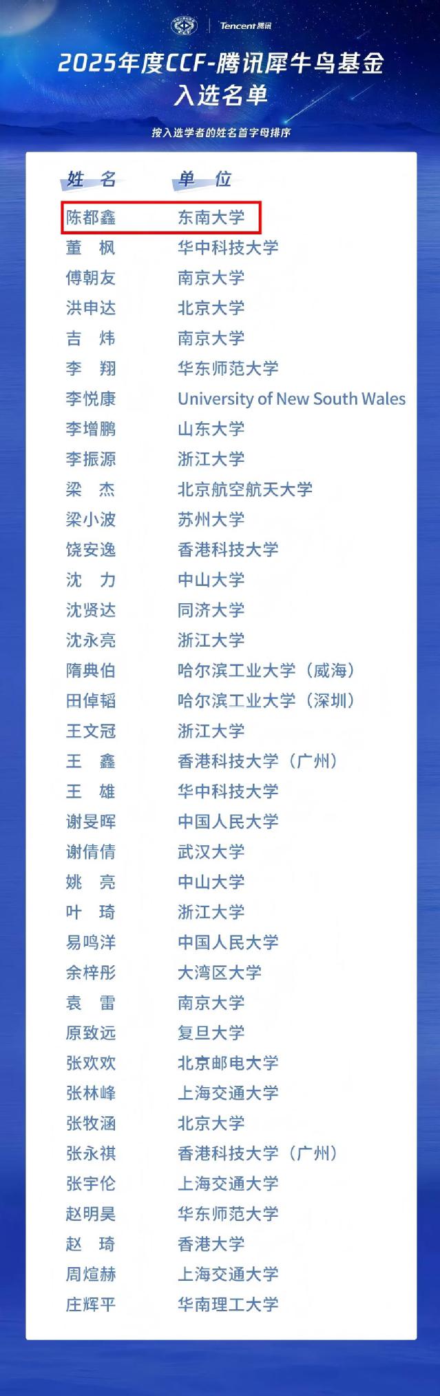7月31日,2025年度CCF-腾讯犀牛鸟基金(以下简称“犀牛鸟基金”)入选名单公布,tyc522cc太阳成集团陈都鑫副教授成功入选。2025年度犀牛鸟基金共收到来自130余所高校的390余份高质量申请,项目组特邀50余位学术界及腾讯技术专家组成评审委员会,基于科研能力、研究价值、学术创新性及方案可行性等维度进行评估,经过多轮严格评审,最终遴选出37位优秀学者。